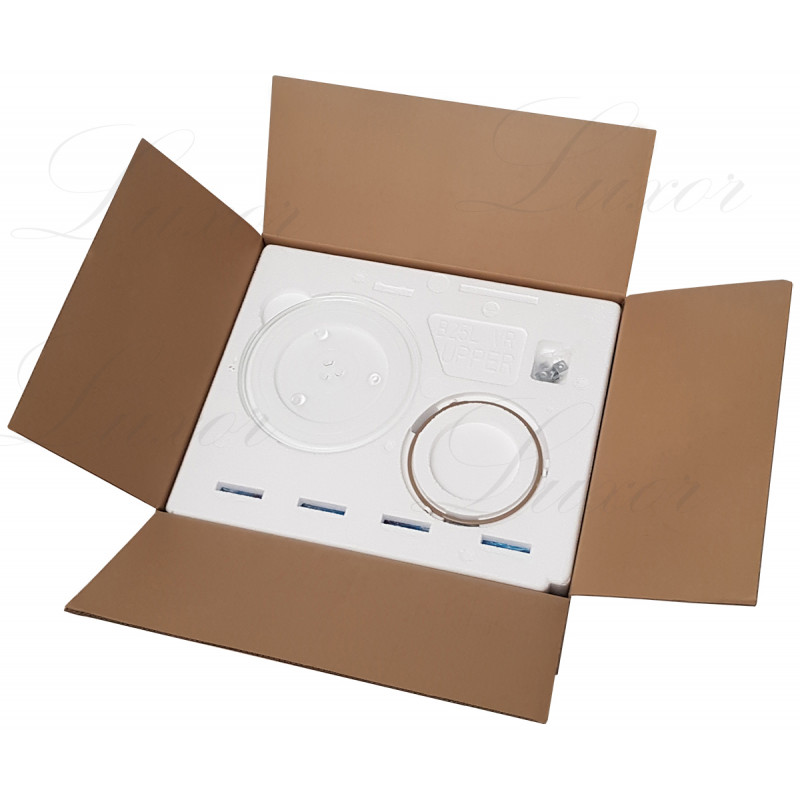 Комплектація Решітка для приготування м'яса на грилі, рамка скляна для вбудовування, інструкція з експлуатації (паспорт), поворотний диск з роликами для піддону, скляний піддон, елемент кріплення.